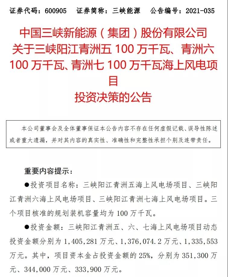 12月20日晚,三峽能源公告,擬投資建設三峽陽江青洲五海上風電場項目、三峽陽江青洲六海上風電場項目、三峽陽江青洲七海上風電場項目,三個項目核準的規劃裝機容量均為100萬千瓦。