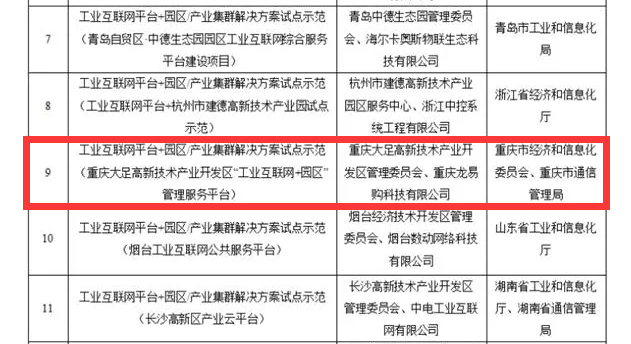 根據《工業(yè)和信息化部辦公廳關于組織開展2021年工業(yè)互聯(lián)網試點示范項目申報工作的通知》(工信廳信管函〔2021〕249號)要求,工業(yè)和信息化部組織開展了相關申報和評審工作,并于近日公布了2021年工業(yè)互聯(lián)網試點示范項目名單。重慶大足高新技術產業(yè)開發(fā)區(qū)管委會聯(lián)合重慶龍易購科技有限公司申報的“重慶大足高新技術產業(yè)開發(fā)區(qū)“工業(yè)互聯(lián)網+園區(qū)”管理服務平臺”被評為2021年工業(yè)互聯(lián)網試點示范項目。