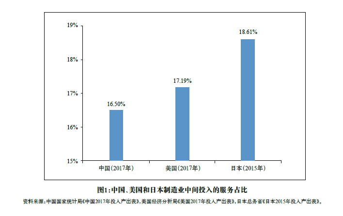 其次,從服務化的視角衡量,中國的新工業化水平顯著低于美國和日本。在服務化發展背景下,制造業中間投入品中服務的占比是衡量新工業化水平的重要標準。以投入產出表為基礎計算的結果顯示,2017年中國制造業的中間品投入中有16.50%來自服務業,分別低于美國0.69個百分點和日本2.11個百分點(見圖1)。