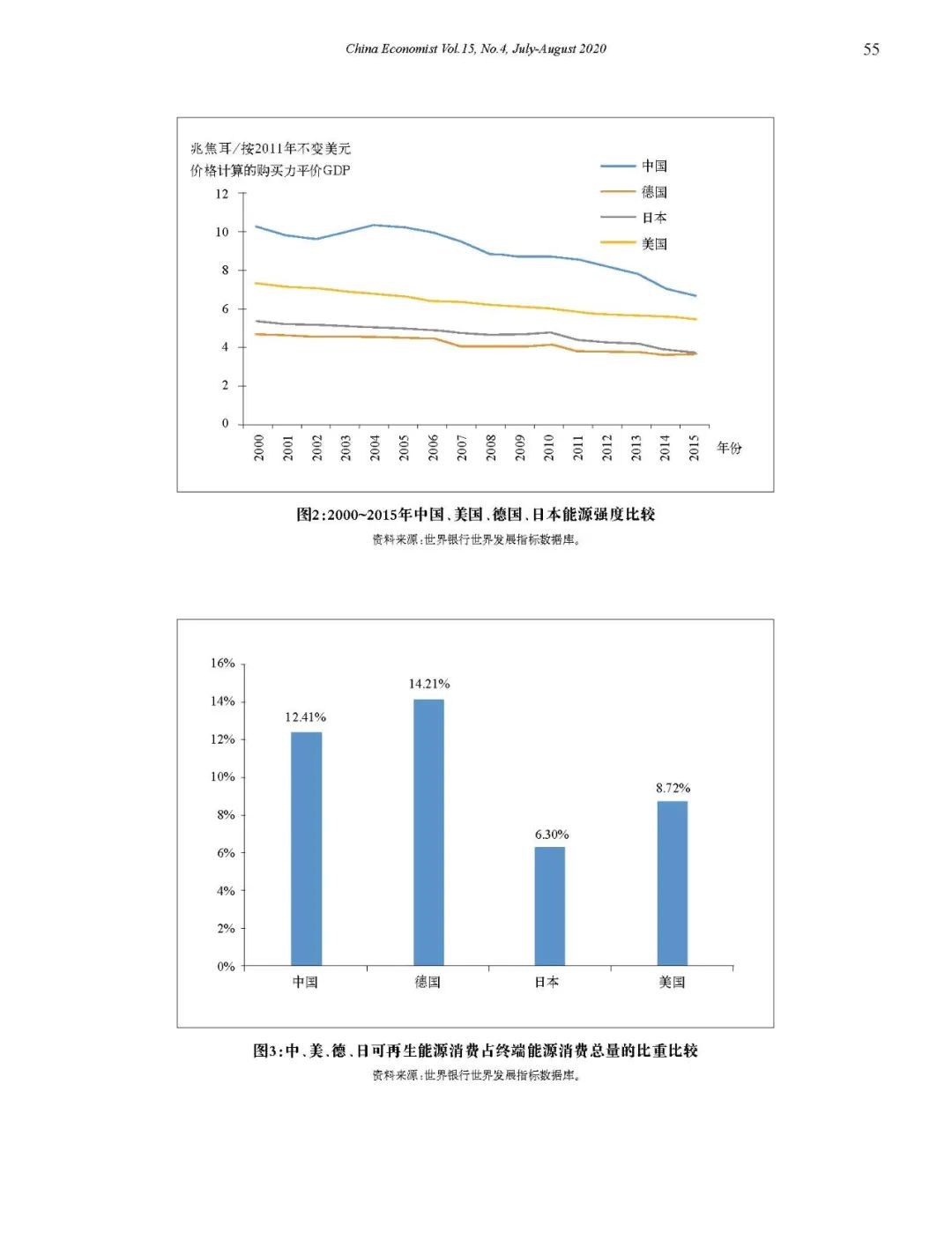 最后,從綠色化的角度衡量,中國的新工業化水平與美國、德國、日本互有高低。近些年來,中國積極推進能源生產和消費革命與生態文明建設,節能減排工作取得了顯著成效,綠色發展水平大幅提升。然而,從國別比較的結果看,中國的能源強度仍然顯著高于發達國家。根據世界銀行數據,2015年,中國能源強度為6.69兆焦耳/按2011年不變美元價格計算的購買力平價G D P,比德國、日本、美國分別高86%、79%、24%(見圖2)。另外,在可再生能源消費占終端能源消費總量的比重這個指標上,中國僅稍落后于德國,但大幅領先美國、日本(見圖3)。