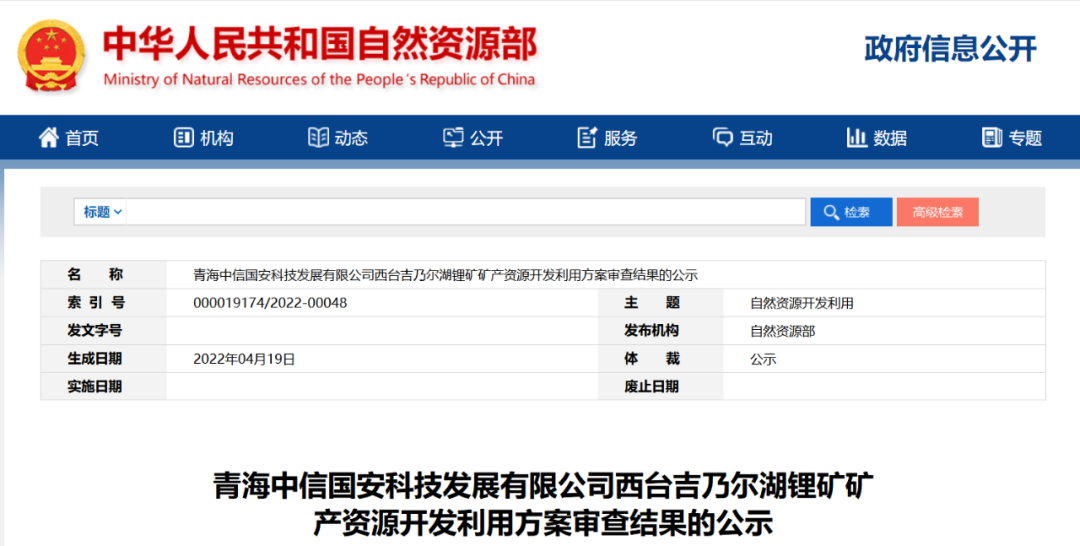4月19日,自然資源部發布《青海中信國安科技發展有限公司西臺吉乃爾湖鋰礦礦產資源開發利用方案審查結果的公示》(以下簡稱《公示》),宣布開發方案已通過專家審查。