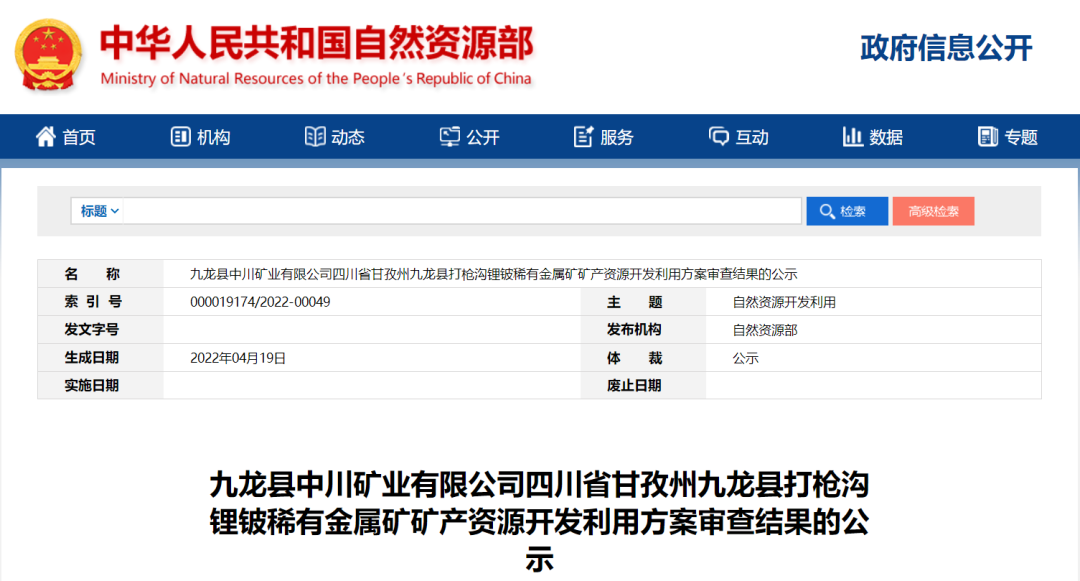 值得注意的是,與西臺吉乃爾湖鋰礦開發方案一同過審的,還有四川省甘孜州九龍縣打槍溝鋰鈹稀有金屬礦的開發方案。