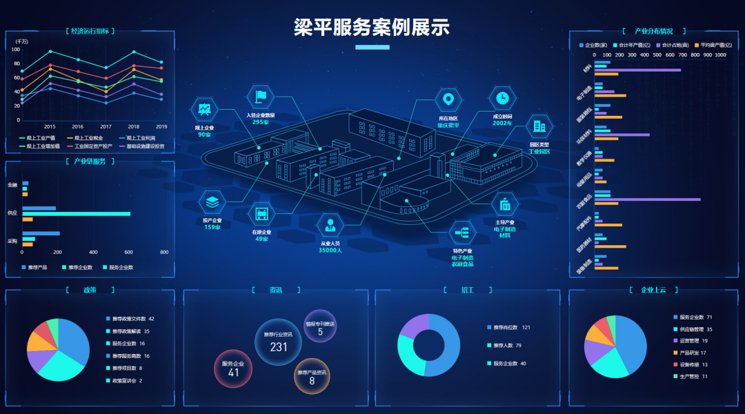 龍智造工業云平臺通過建設和運營梁平智慧園區,整合了園區內外資源,實現基礎設施網絡化、管理精細化、服務功能專業化和產業發展智能化,以此提高梁平工業園區產業聚集能力、可持續創新發展、區域協同發展及企業競爭力。滿足了天勝電子、仟和鎂業、巨源不銹鋼等公司的融資、資訊、招標、政策、供應鏈、智能化改造等需求。