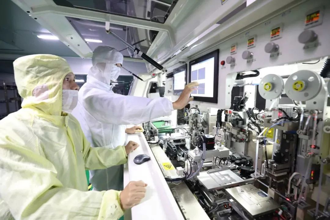 天勝電子生產車間,技術人員在觀察顯示屏自動組裝。(資料圖)