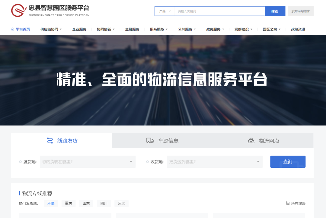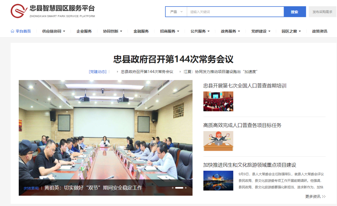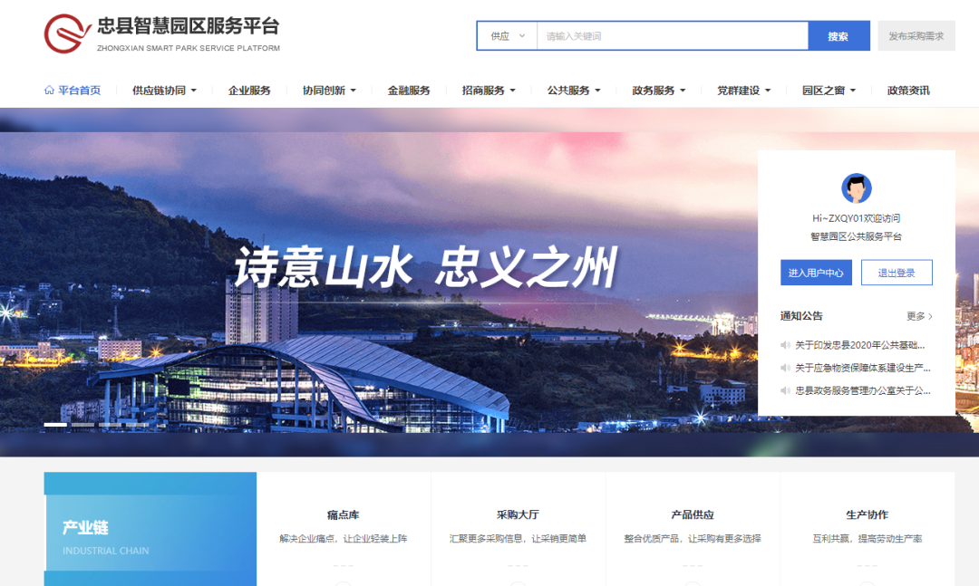 忠縣智慧園區(qū)服務(wù)平臺(cqzxyq.cqsmartpark.cn)于2019年6月始開發(fā),2020年4月完成服務(wù)平臺的整體功能建設(shè)。