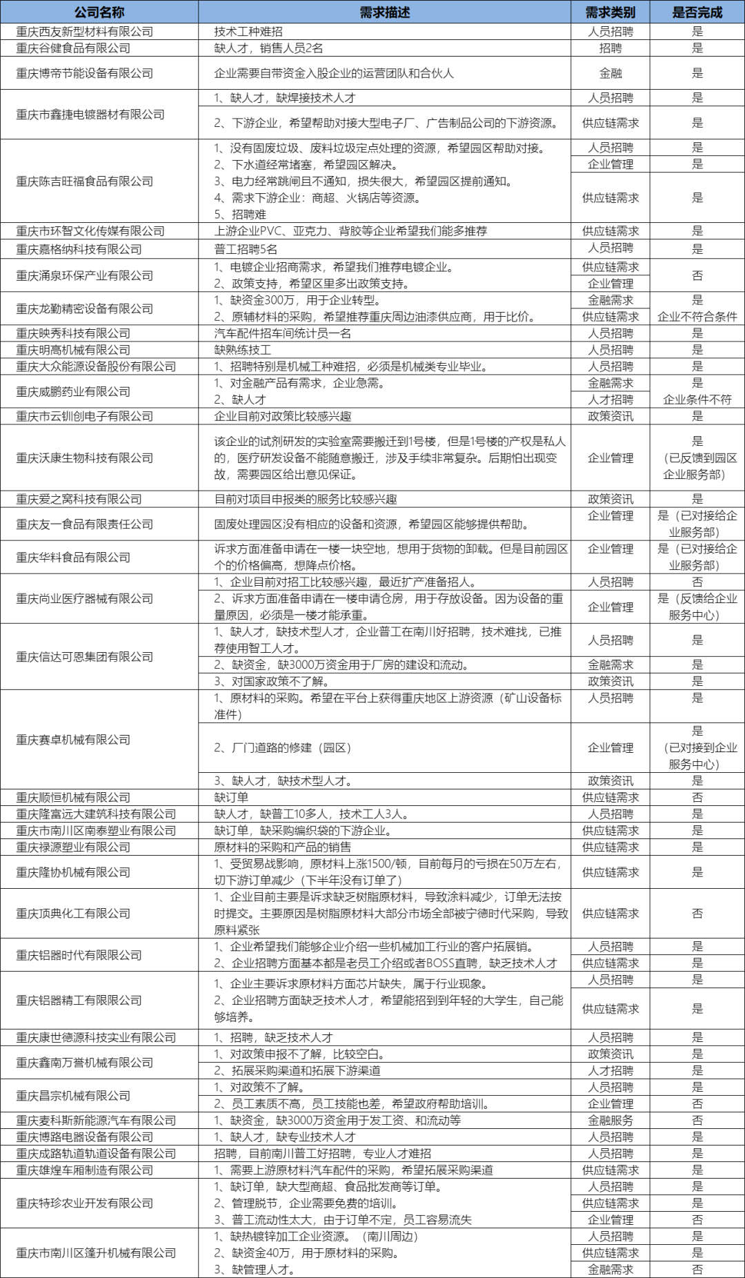 實地走南川工業園區企業80余家:重慶鑫南萬譽機械有限公司,重慶明高機械制造有限公司,重慶大眾能源設備股份有限公司,重慶海塑南邦鋁業有限公司,重慶搏雙建材有限公司?,重慶友一食品有限公司,重慶昌宗機械有限公司,重慶賽納科技有限公司,重慶德蒙機械制造有限公司,重慶渝沿印務有限公司,重慶谷健食品有限公司等等,引導企業上平臺,講解平臺后臺操作,利用平臺資源解決企業實際遇到的難題,搜集解決企業問題62條:招工43條;供應鏈需求10條,金融5條,企業管理需求4條。
