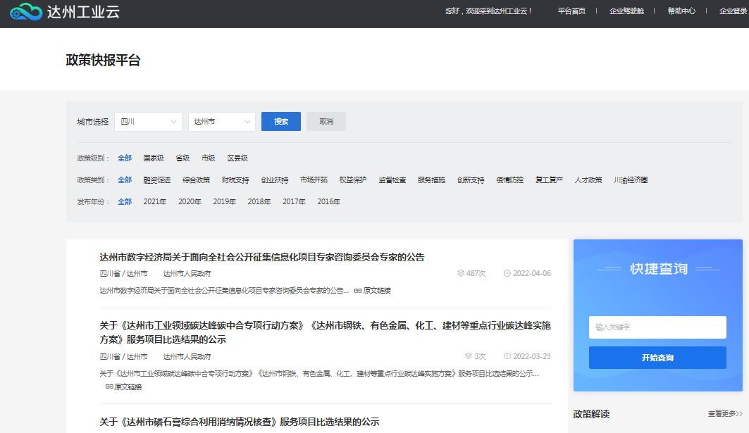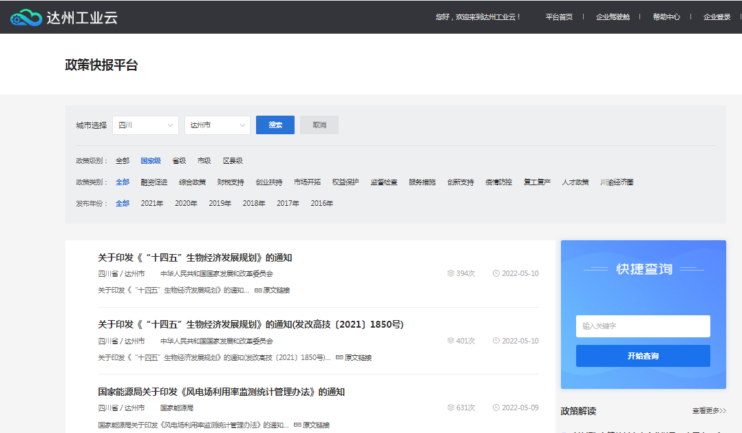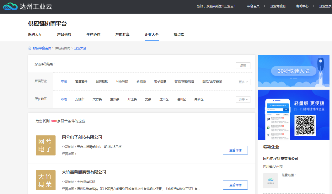 企業對供應鏈協同、商機搜索、創新資源、物流資源、企業展示、藍領直招、大數據智采系統、政策快報系統智工人才與藍領直招,達州工業云平臺與智工人才等各項子功能的內容進行打通和完善,使其各企業入駐后可順利開展相關信息的發布。截止2022年6月30日累計入駐平臺企業874家,服務企業上云平臺647次。