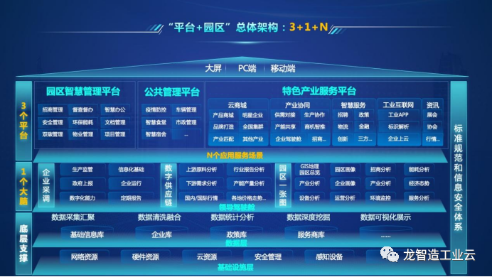 憑借著良好的工業(yè)企業(yè)基因與智慧園區(qū)經(jīng)驗,龍智造整合龍智造品牌資源,打造全鏈條“工業(yè)互聯(lián)網(wǎng)+園區(qū)”一站式產(chǎn)業(yè)服務(wù)平臺,初步形成“3+1+N”解決方案總體架構(gòu),即3個平臺——園區(qū)智慧管理平臺、公共管理平臺、特色產(chǎn)業(yè)服務(wù)平臺,1個大腦——園區(qū)數(shù)據(jù)中臺,N個應(yīng)用服務(wù)場景——產(chǎn)業(yè)招商系統(tǒng)、數(shù)字供應(yīng)鏈、人才大數(shù)據(jù)服務(wù)平臺、安全生產(chǎn)管理系統(tǒng)等。