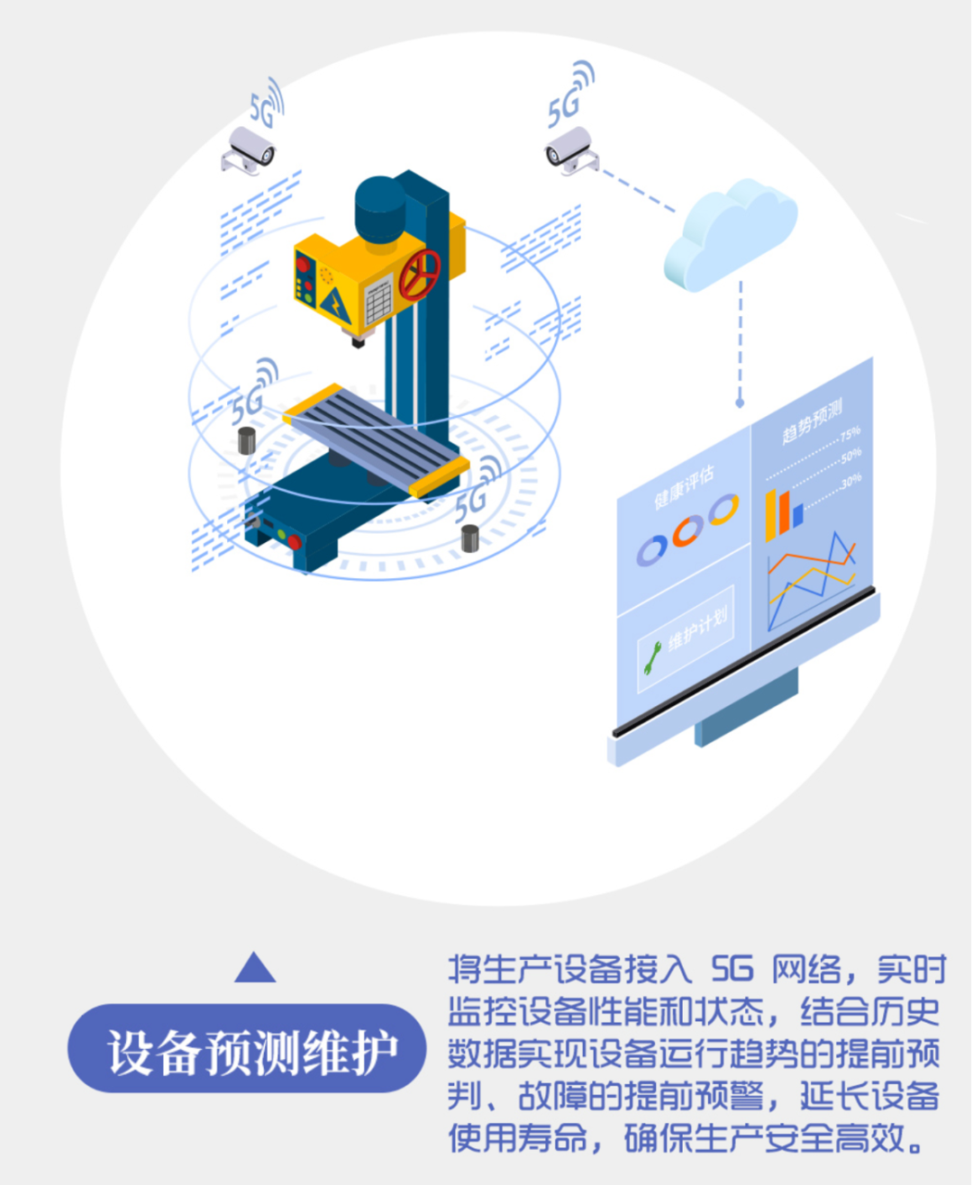 將企業(yè)生產(chǎn)現(xiàn)場(chǎng)的工業(yè)設(shè)備、攝像頭、傳感器等接入5G網(wǎng)絡(luò),實(shí)時(shí)傳輸設(shè)備的運(yùn)行狀態(tài)至云平臺(tái),實(shí)現(xiàn)工業(yè)生產(chǎn)設(shè)備性能和狀態(tài)的實(shí)時(shí)監(jiān)控,構(gòu)建設(shè)備歷史監(jiān)測(cè)數(shù)據(jù)庫(kù)。基于故障預(yù)測(cè)機(jī)理建模等人工智能技術(shù)對(duì)監(jiān)測(cè)數(shù)據(jù)進(jìn)行實(shí)時(shí)分析,評(píng)估設(shè)備健康狀態(tài),預(yù)判設(shè)備運(yùn)行趨勢(shì),智能制定設(shè)備維護(hù)保養(yǎng)計(jì)劃,實(shí)現(xiàn)設(shè)備安全預(yù)測(cè)與生產(chǎn)輔助決策,有效降低設(shè)備維護(hù)成本,延長(zhǎng)設(shè)備使用壽命,確保生產(chǎn)過(guò)程連續(xù)、安全、高效。