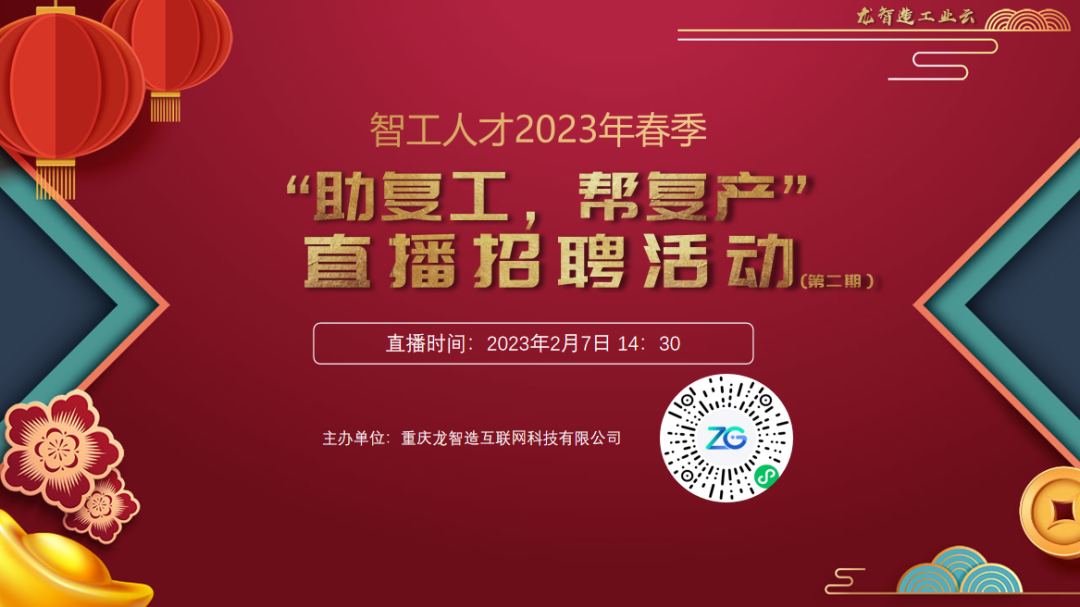為暢通用人單位招聘和各求職者的求職渠道,切實做好企業復工復產服務工作,幫助廣大求職者充分就業。重慶龍智造互聯網科技有限公司旗下智工人才平臺特開展2023年“助復工,幫復產”直播招聘活動。推動企業招工服務工作有力有序開展。同期線上專場招聘會活動也將持續開展,線上專場招聘會時間將持續至2月28日。本期直播招聘活動將于2月7日14:30準時開始。
