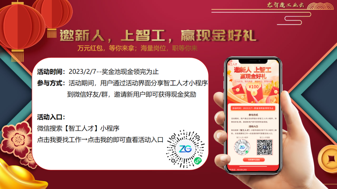 用戶通過活動界面分享智工人才小程序到微信好友/群,邀請新用戶注冊簡歷,即可獲得現金獎勵