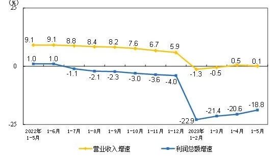 6月28日,國家統計局發布數據顯示,1-5月,全國規模以上工業企業實現利潤總額26688.9億元,同比下降18.8%,降幅比1-4月收窄1.8個百分點;規模以上工業企業實現營業收入51.39萬億元,同比增長0.1%。