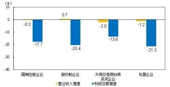 從經濟類型來看,1-5月,國有控股企業實現利潤總額9625.1億元,同比下降17.7%;股份制企業實現利潤總額19578.1億元,下降20.4%;外商及港澳臺商投資企業實現利潤總額6267.5億元,下降13.6%;私營企業實現利潤總額6837.8億元,下降21.3%。
