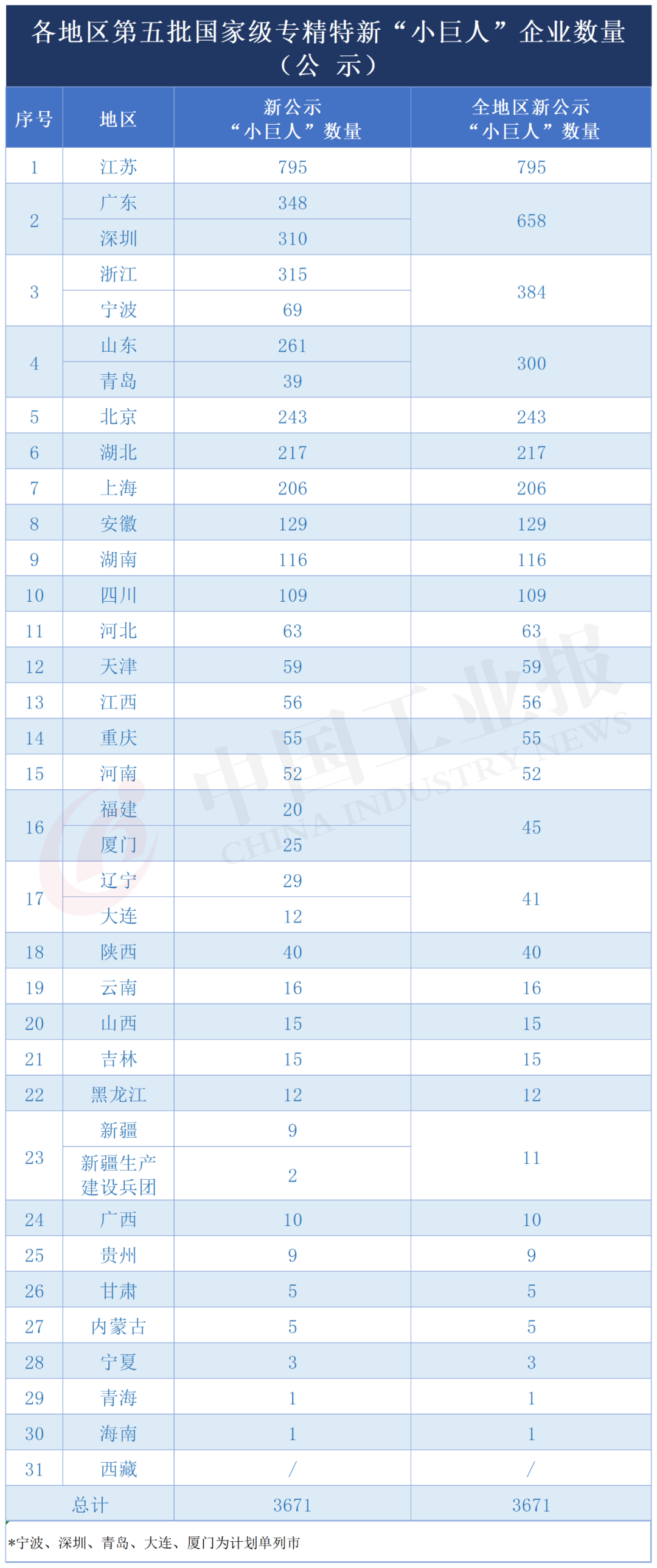 近日,第五批國家級專精特新“小巨人”企業公示名單出爐,全國總計3671家,相較于第四批明顯減少。蘇粵浙小巨人數量依舊領跑全國,位列前三,只不過排位有所變化。江蘇與第四批的第一名浙江互換位置,深圳的第五批小巨人數量與整個浙江省相差無幾。初步統計,前五批國家級專精特新“小巨人”企業預計超過1萬家,這意味著“到2025年,培育1萬家國家級專精特新‘小巨人’企業”的目標或將提前完成。江蘇、廣東、浙江、山東、北京、湖北、上海、安徽、湖南、四川等地的國家級專精特新“小巨人”企業數量位居前10。其中,江蘇、廣東、浙江分別以795家、658家、384家位居前三甲。在5個計劃單列市中,深圳以310家的數量位居第一,而寧波、青島、廈門、大連分別為69家、39家、25家、12家,合計145家。