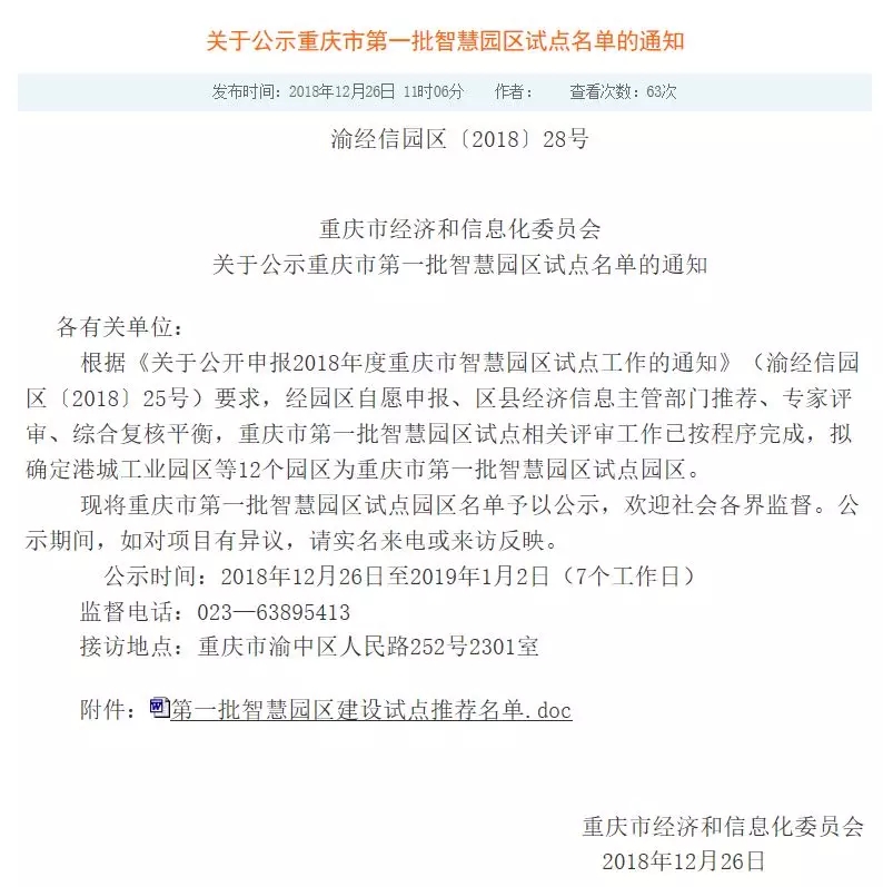 12月26日,重慶市經濟和信息化委員會公布了重慶市第一批智慧園區試點園區名單。