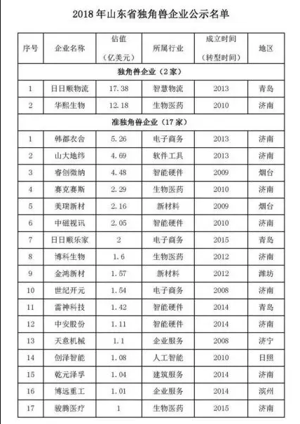 5月29日,山東省工信廳對2018年山東省獨角獸、準獨角獸企業名單進行了公示。日日順物流、華熙生物兩家企業獲評獨角獸企業,韓都衣舍、山大地緯等17家企業獲評準獨角獸企業。值得一提的是,這次19家公司的企業名單中,有10家來自濟南,占據了名單的半壁江山席位。