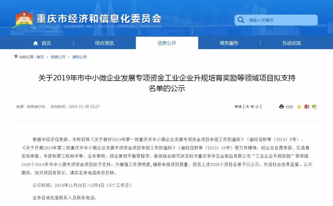 根據重慶市經濟信息委、市財政局《關于做好2019年第一批重慶市中小微企業發展專項資金項目申報工作的通知》(渝經信財審〔2019〕5號)、《關于開展2019年第二批重慶市中小微企業發展專項資金項目申報工作的通知》(渝經信財審〔2019〕10號)等文件精神,經企業自愿申報、區縣真實性審查、專家和第三機構評審、業務審核、綜合復核平衡等程序,經信委黨組會研究決定擬對重慶市“工業企業升規獎勵”、“產業互聯網平臺運營績效獎補”、“專精特新”、“中小微企業股改掛牌獎勵”、“樓宇產業園和小企業創業基地運行績效獎補”、“‘創客中國’創新創業大賽獲獎項目獎補”、“中小企業公共服務平臺服務績效獎補”、“中小企業融資服務專項績效獎補”、“中小企業技術創新服務專項績效獎補”、“中小微企業市場開拓資金補助”等13個領域的2026個2019年市中小微專項資金項目給予支持。