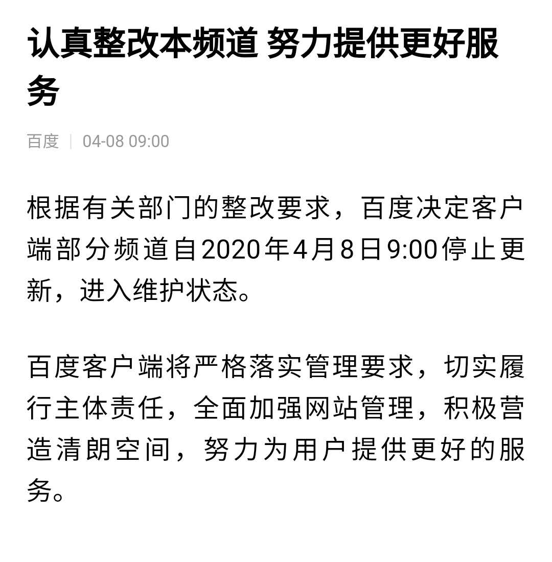 4月7日百度負責人被國家互聯網信息辦公室指導北京市互聯網信息辦公室約談,主要關于百度APP違規問題?;ヂ摼W信息辦公室要求百度立即整改旗下的違規APP,現在百度APP推薦頻道、圖片頻道、視頻頻道、財經頻道、科技頻道自4月8日上午9時起暫停更新,清理違規內容,開展深入整改。