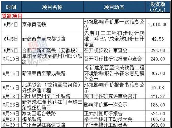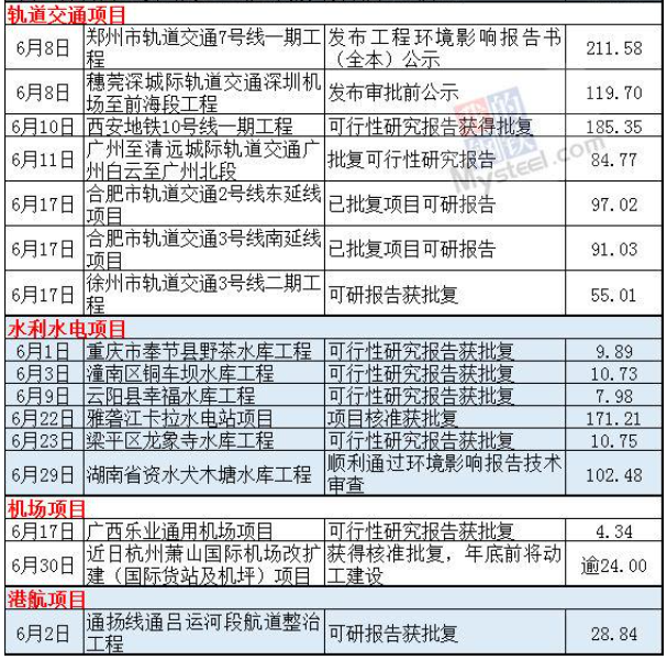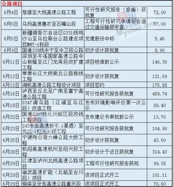 據Mysteel不完全統計,2020年6月份,國家發改委及地方發改委、交通廳等相關部門公布了43項重大基建項目的最新進展,合計總投資超7400億元。