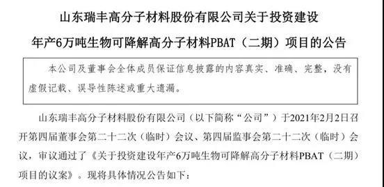 瑞豐高材:6萬噸PBAT項(xiàng)目今年第三季度竣工