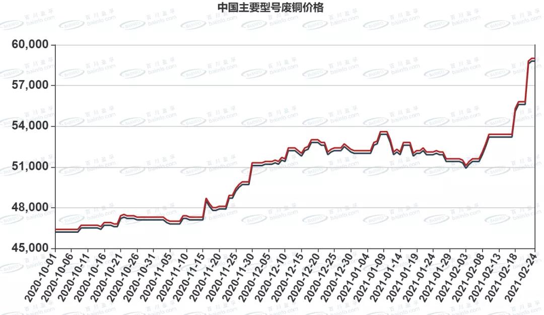 銅價暴漲,廢銅也瘋狂。來自百川盈孚的數據顯示,2月3日以來,廢銅價格快速攀升。以紫銅為例,價格從2月3日的每噸50700元漲至2月24日的每噸58600元,漲幅達15.58%。特別是2月17日以來,紫銅價格進入加速上升期,短短7天上漲10.76%。