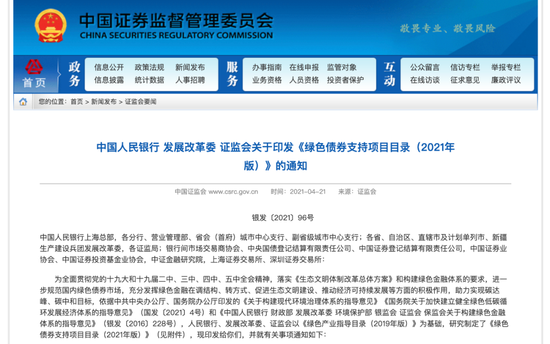 央行4月21日消息,近日,中國人民銀行、國家發展和改革委員會、中國證監會聯合發布《關于印發〈綠色債券支持項目目錄(2021年版)〉的通知》,并隨文發布《綠色債券支持項目目錄(2021年版)》(以下簡稱《綠債目錄(2021年版)》)。