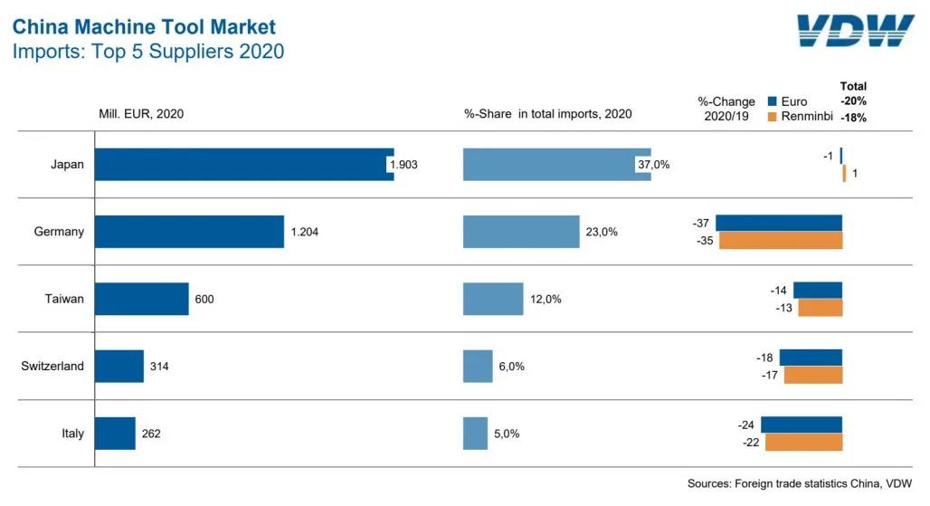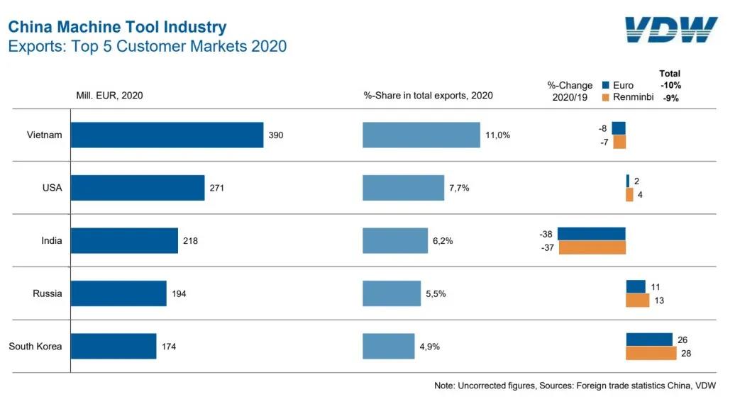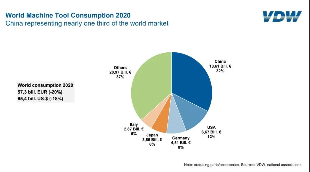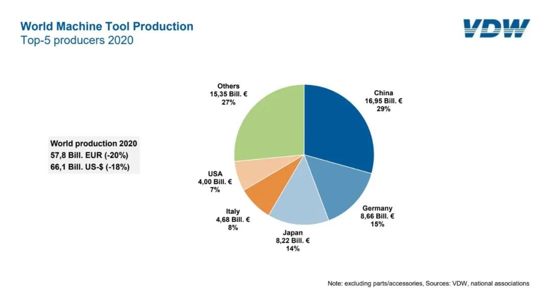 機床行業技術水平和產品質量是衡量一個國家裝備制造業發展水平的重要標志。同時機床作為通用設備,在整個制造業中有很強的順周期性,工業企業的利潤指標是通用設備行業的景氣度的領先指標。德國機床制造商協會發布官方數據,獨家分析當前中國對世界范圍內機床行業的影響及競爭優勢。從機床供給市場來看,2020年全球機床行業產值為578億歐元,中國產值位居世界第一位,產值為169.5億歐元,在全球市場中占據份額為29%。德國、日本產值分別為86.6億歐元和82.2億歐元,分別位居全球第二和第三,在全球市場中的份額分別為15%和14%。中國、德國和日本三個國家占據了全球58%的份額。注:統計不包括機床零部件產值。數據來源:德國機床制造商協會,德國國家級協會從機床需求市場來看,2020年全球機床行業消費額為573億歐元,其中中國消費額位居世界第一位,消費額為186.1億歐元,在全球需求市場中占據份額為32%。美國、德國消費額分別為66.7億歐元和45.1億歐元,分別位居全球第二和第三,在全球需求市場中的份額分別為12%和8%。中國、美國和德國三個國家占據了全球52%的份額。注:統計不包括機床零部件產值。數據來源:德國機床制造商協會,德國國家級協會中國機床行業在過去十年間出口量呈增長趨勢,已從2011年18億歐元出口額增長至2019年近40億歐元出口額。越南、美國、印度、俄羅斯及朝鮮為中國機床行業2020年全球前五消費市場,占總出口量35.5%,消費金額達12.47億歐元。2020年盡管全球制造業受疫情影響發展滯緩,中國機床出口增長率較2019年下降10%,但美國、俄羅斯和朝鮮進口中國機床的消費額分別有2%、11%和26%的增長。根據中國機床工具工業協會和德國機床制造商協會統計顯示,中國機床進口額自2011年總體呈下降趨勢,進口額自2018年82億歐元下降至2020年52億歐元。其中中國對前五的供應地區(占進口總額83%):日本、德國、中國臺灣、瑞士及意大利在2020年的進口比例均有1%至37%的減少。