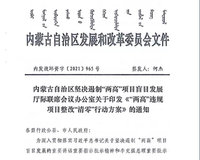 內蒙古日前啟動“兩高”違規項目清理整改情況明查暗訪“回頭看”工作,工作包括督導上半年未完成能耗雙控目標任務的通遼市、阿拉善盟整改措施落實情況等。內蒙古近期印發《“兩高”違規項目整改“清零”行動方案》(以下簡稱《方案》),全面開展違規“兩高”項目分類處置,實現整改“清零”。