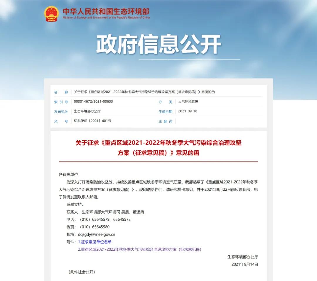 9月16日,生態環境部辦公廳發布關于征求《重點區域2021-2022年秋冬季大氣污染綜合治理攻堅方案(征求意見稿)》(以下簡稱《意見》)指出,上半年“兩高”行業產品產量、煤炭消費量等出現明顯反彈,大氣環境質量持續改善壓力增大。要求堅決遏制“兩高”項目盲目發展,有序推進北方地區清潔取暖等,強化區域聯防聯控,積極應對重污染天氣。