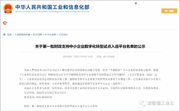 2022-1010月30日,國家工業和信息化部中小企業局印發《關于第一批財政支持中小企業數字化轉型試點入選平臺名單的公示》,重慶龍易購科技有限公司“以下簡稱“龍易購”入選成為本批次重慶5家入選企業之一。 此次入選,標