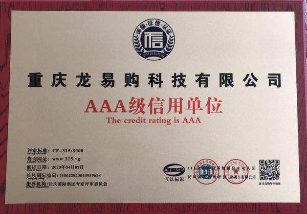 2020-04近日,重慶龍易購(gòu)科技有限公司經(jīng)“315全國(guó)征信系統(tǒng)”評(píng)定為“AAA級(jí)信用單位”,并榮獲“AAA級(jí)誠(chéng)信經(jīng)營(yíng)示范單位”和“AAA級(jí)質(zhì)量服務(wù)信譽(yù)單位”等榮譽(yù)。其董事長(zhǎng)胡守榮和常務(wù)副總經(jīng)理白冰分別榮獲“誠(chéng)信企業(yè)家”和“誠(chéng)信經(jīng)理人”稱號(hào)。