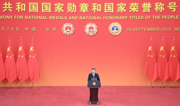 在慶祝中華人民共和國成立75周年之際,我們在這里隆重舉行儀式,將國家最高榮譽(yù)授予為國家建設(shè)和發(fā)展建立了卓越功勛的杰出人士和為促進(jìn)中外交流合作作出杰出貢獻(xiàn)的國際友人。首先,我代表黨中央、全國人大、國務(wù)院和中央軍委,向獲得“共和國勛章”和國家榮譽(yù)稱號的英雄模范、獲得“友誼勛章”的國際友人,表示熱烈祝賀!致以崇高敬意!